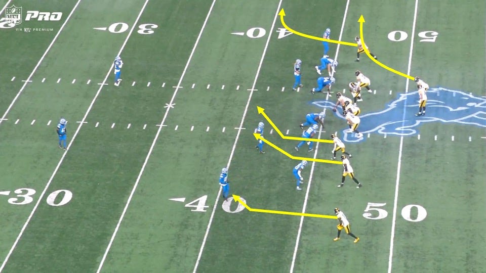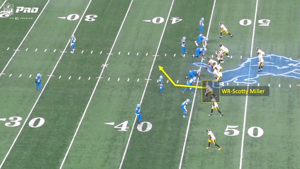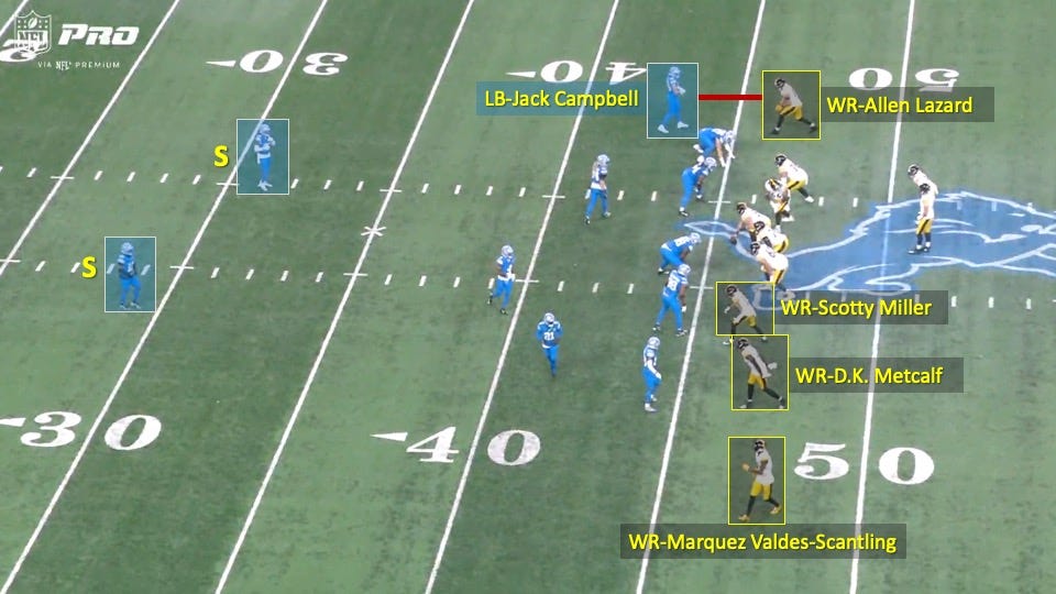 They came out in a 3x1 formation with 3 receivers to the left and tight end Pat Freiermuth to the backside. The Lions were showing a 2 deep look and had linebacker Jack Campbell aligned over Freiermuth on the outside. That was a good indicator that this was man coverage: