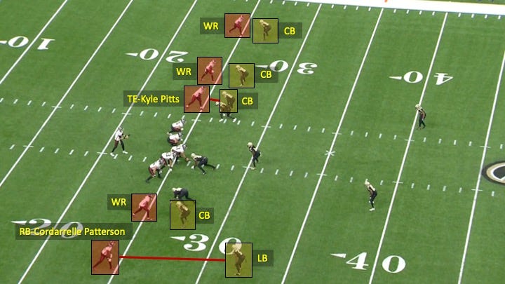 The Saints used their 4 cornerbacks on the field to match up to Atlanta’s 3 wide receivers and Pitts. That left only a safety or linebacker to take Patterson on the perimeter. The Saints put linebacker Kwon Alexander over him, meaning they were treating him as they would a running back:
