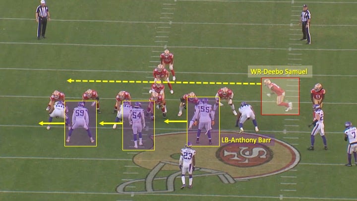 Before the snap, wide receiver Deebo Samuel motioned across the formation, getting Minnesota’s linebackers to shift to the motion side (Pay attention to how Anthony Barr (#55) shifted from the B-Gap to the A-Gap):