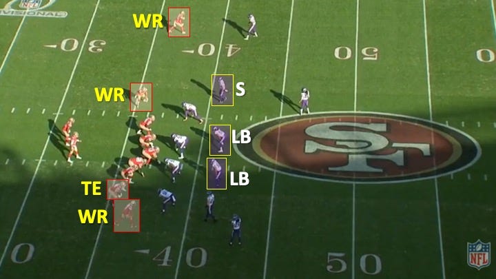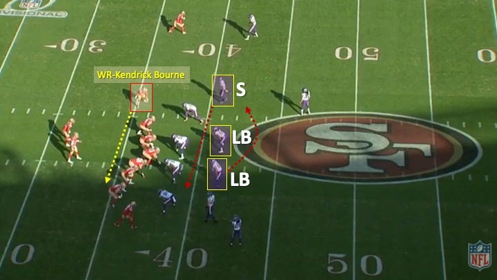 Wide receiver Kendrick Bourne then motioned from left to right across the formation. This created a 3×1 alignment. The Vikings responded by having the safety over Bourne follow him to get more defensive backs to the 3-receiver side. The linebacker to the other side of the formation then traded places with him: