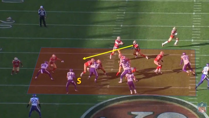 However, the damage was done. The motion left the Vikings with just 6 men in the box and it forced them to replace a linebacker inside with a smaller safety. The 49ers then ran the ball right at him: