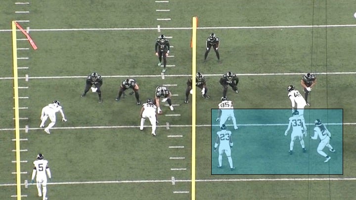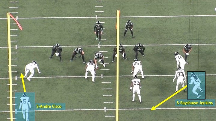 But the Jaguars wouldn’t be bringing pressure from Wilson’s left. Safety Rayshawn Jenkins, initially part of the blitz look, dropped back to the middle of the field. Safety Andre Cisco would then drop down on the other side of the formation and end up blitzing instead: