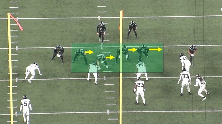 Due to the blitz look and the alignment of the defensive tackle in the A-gap to the center’s right, the Jets used a 4-man slide to account for the potential pressure: