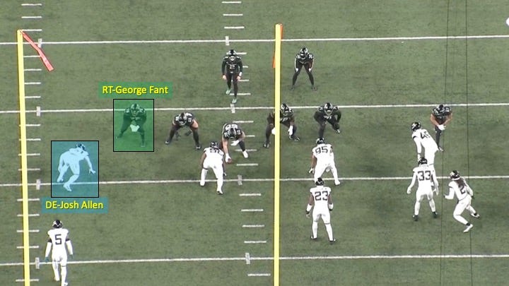 That meant right tackle George Fant would be in a man-to-man situation with defensive end Josh Allen: