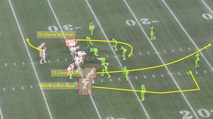 They had a dagger concept called off of a play-action boot-stop to the left. George Kittle would run the thru route with Brandon Aiyuk running the dig and tight end Charlie Woerner sneaking out late as the checkdown: