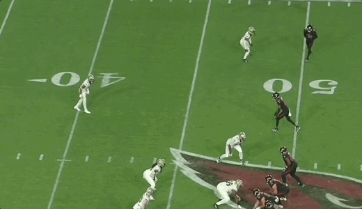Watch how he created separation in both examples by stepping on his defender’s toes to sell the go-route before stopping on a dime: