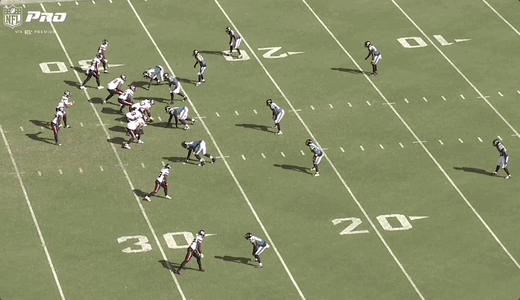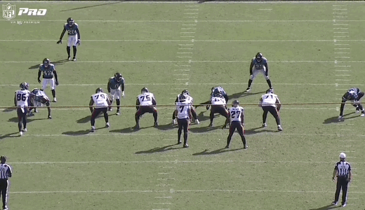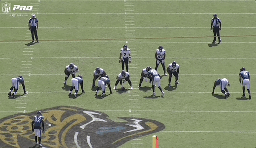This 3rd-and-13 was a great example. The Jaguars came out in a tilted front with 3 down-linemen to the left of the center. They also dropped linebacker Foye Oluokun down between the right guard and tackle to create 1-on-1’s across the board: